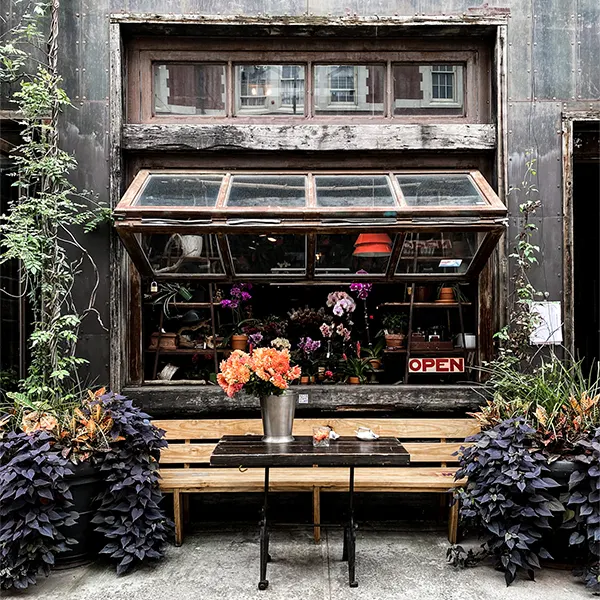 Enchanting flower and plant shop with a rustic shopfront and giant folding window.