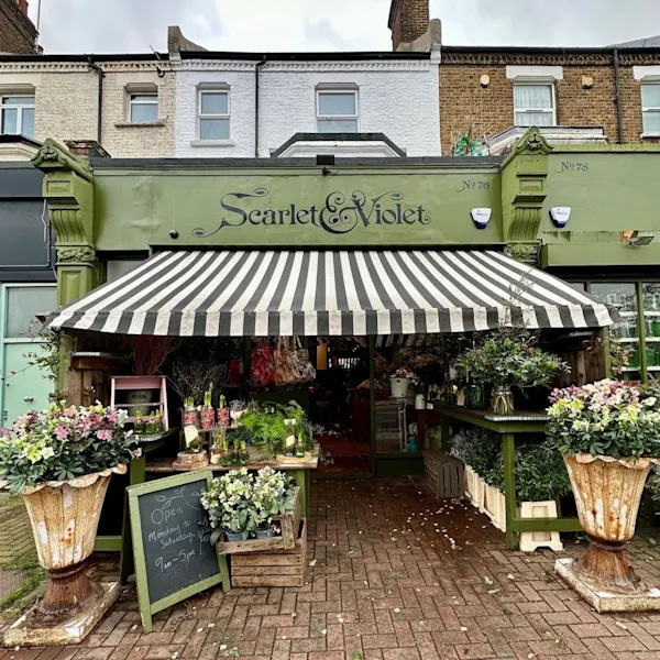 Pretty Primrose Hill flower shop with hand-tied bouquets in black & white striped bags.