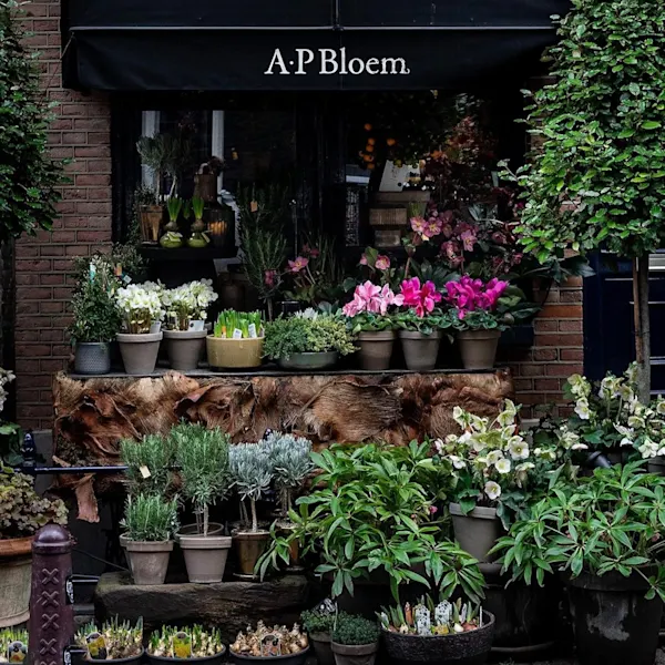 A flower shop in the heart of the Amsterdam canals, with a beautiful shopfront display.