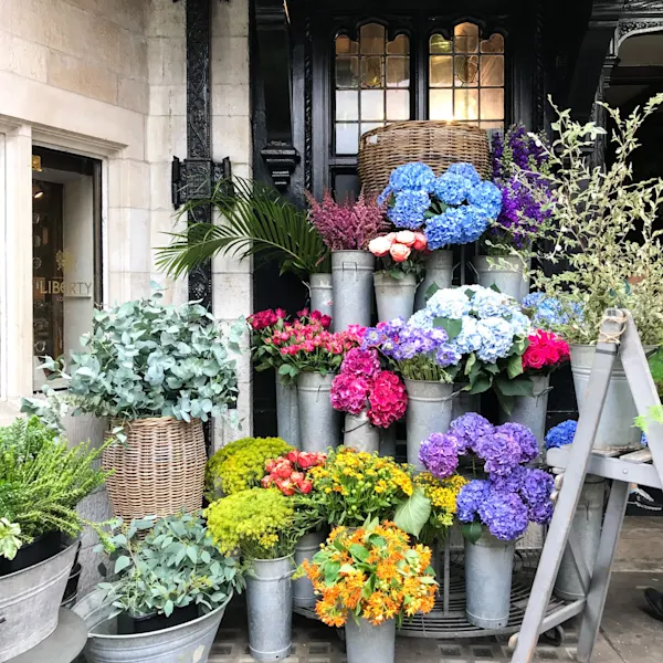 Vintage-style vessels and colorful blooms fill this London flower shop.