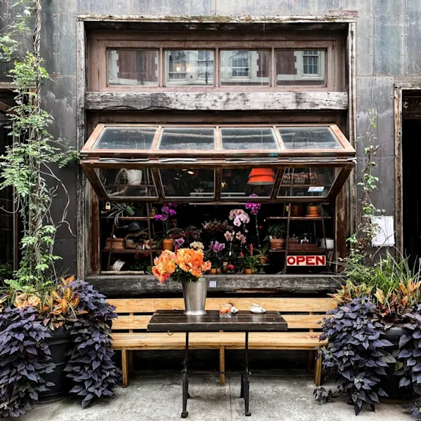 Enchanting flower and plant shop with a rustic shopfront and giant folding window.