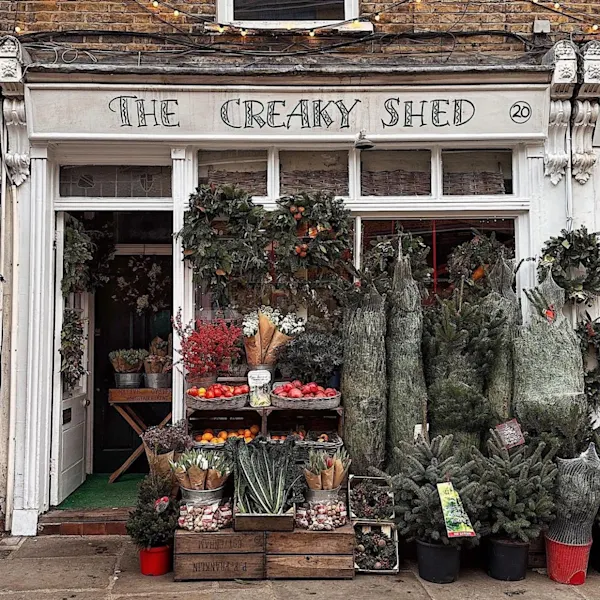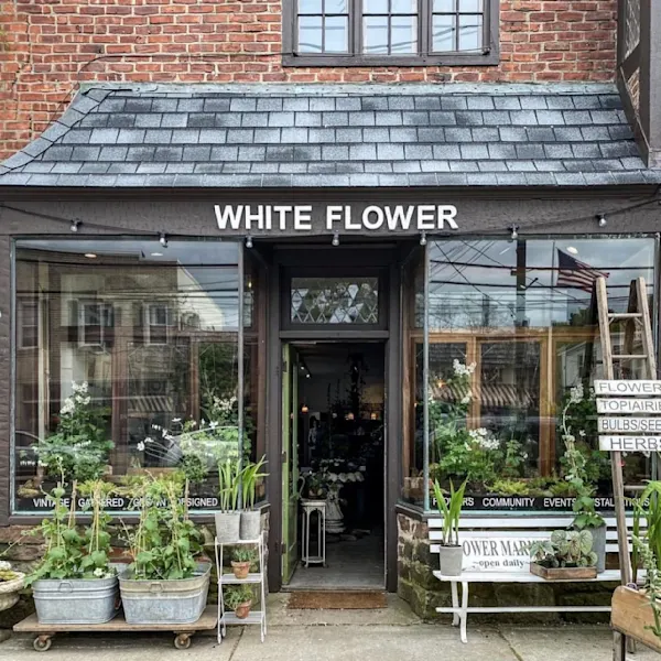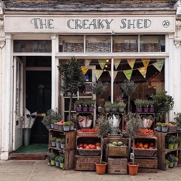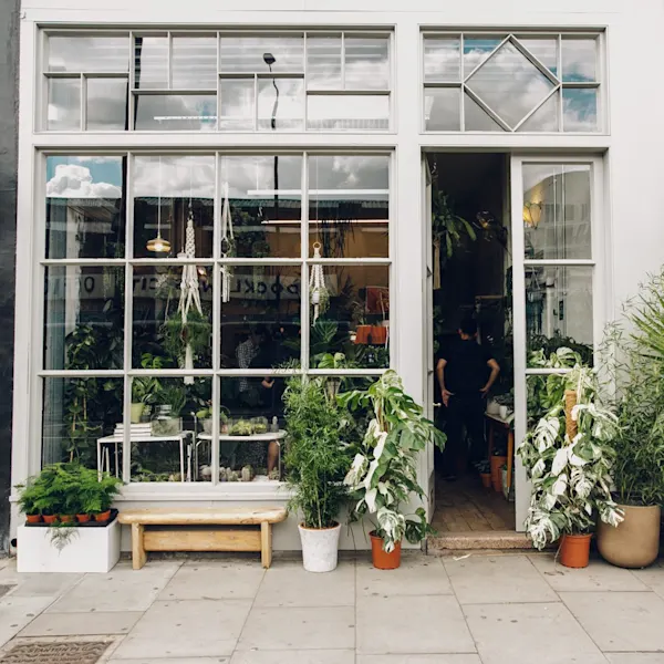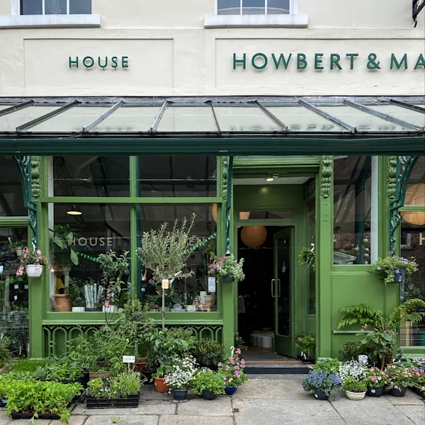 House and garden shops with a selection of plants, gardening supplies, and home decor.