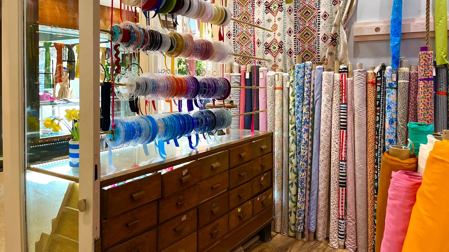 What makes our shop interesting is that you could be coming in on a mission for some haberdashery and get distracted by an exquisite hanging of interior fabric