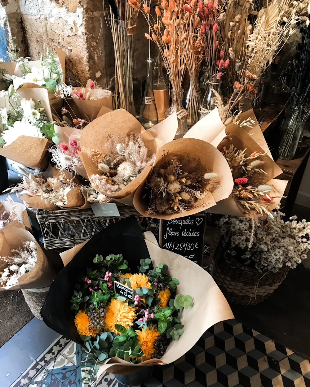 One of the Paris’ prettiest flower shops, situated in the 11th arrondissement, close to Place de République. Located across the street from Merci concept store that is always a must-visit when in Paris. Fragrance is a flower shop and tea salon. The space has beautiful details; a colored tile floor (the same as featured on Astier de Villatte’s notebooks), raw stone walls and a pretty painted shopfront. Fresh blooms and dried flowers are wrapped in Kraft paper. Vintage tables and baskets are filled with plants and succulents. Fragrance Paris is the perfect place to sit amongst fragrant flowers and savor one of their organic teas.